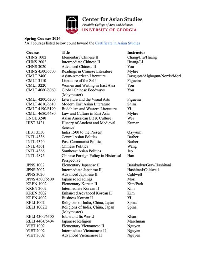 Image: Spring Courses 2026 *All courses listed below count toward the Certificate in Asian Studies Course Title Instructor CHNS 1002 Elementary Chinese II Chang/Liu/Huang CHNS 2002 Intermediate Chinese II Huang/Li CHNS 3020 Advanced Chinese II You CHNS 4500/6500 Readings in Chinese Literature Myhre CMLT 2400 Asian-American Literature Dasgupta/Aigbogun/Norris/Mori CMLT 3110 Literature of the Self Figueira CMLT 3220 Women and Writing in East Asia You CMLT 4060/6060 Global Chinese Foodways (Maymester) You CMLT 4200/6200 Literature and the Visual Arts Figueira CMLT 4610/6610 Modern East Asian Literature Shim CMLT 4190/6190 Buddhism and Western Literature Yi CMLT 4680/6680 Law and Culture in East Asia Myhre ENGL 3240 Asian American Lit & Culture Wei HIST 3421 History of Ancient and Medieval Science Kumar HIST 3550 India 1500 to the Present Qayyum INTL 4336 Central Asian Politics Barber INTL 4340 Post-Communist Politics Barber INTL 4361 Chinese Politics Wang INTL 4366 Southeast Asian Politics Jap INTL 4875 Chinese Foreign Policy in Historical Perspective Han JPNS 1002 Elementary Japanese II Barakadyn/Gray/Hashitani JPNS 2002 Intermediate Japanese II Hashitani/Caldwell JPNS 3020 Advanced Japanese II Caldwell JPNS 4500/6500 Japanese Readings Mori KREN 1002 Elementary Korean II Kim/Park KREN 2002 Intermediate Korean II Kim KREN 3002 Enhanced Advanced Korean II Kim KREN 4002 Business Korean II Yi RELI 1002 Religions of India, China, Japan Spina RELI 1002E Religions of India, China, Japan (Maymester) Spina RELI 4300/6300 Islam and Its World Khan RELI 4404/6404 Japanese Religion Marchman VIET 1002 Elementary Vietnamese II Nguyen VIET 2002 Intermediate Vietnamese II Nguyen VIET 3002 Advanced Vietnamese II Nguyen